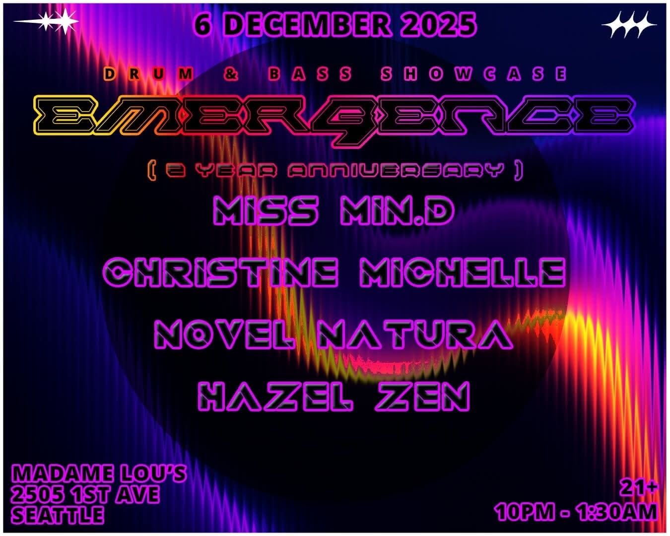 Emergence DnB is back to celebrate our 2 YEAR ANNIVERSARY! This will also be the last show at Madame Lou’s! Have no fear – we are on the hunt for a new spot and are working to launch at a new spot in early 2026!