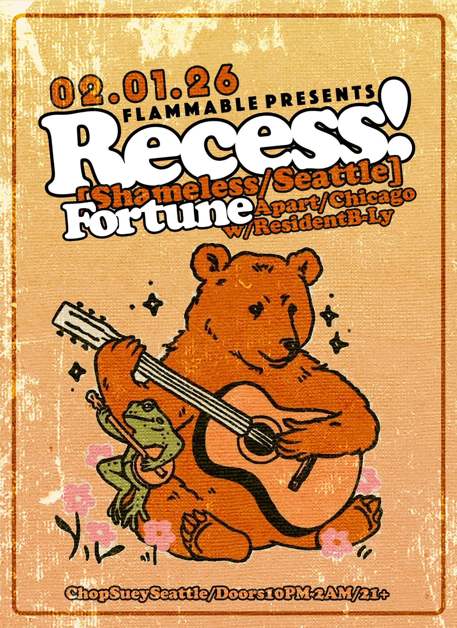 Sunday Feb 1st at Flammable… Hometown hero & Shameless papa RECESS is back under the red light for another Flamm sesh! Also proudly featuring FORTUNE & her Chi-sound on direct support! B-Ly sets some pace on the opening set…Only at Chop Suey!
