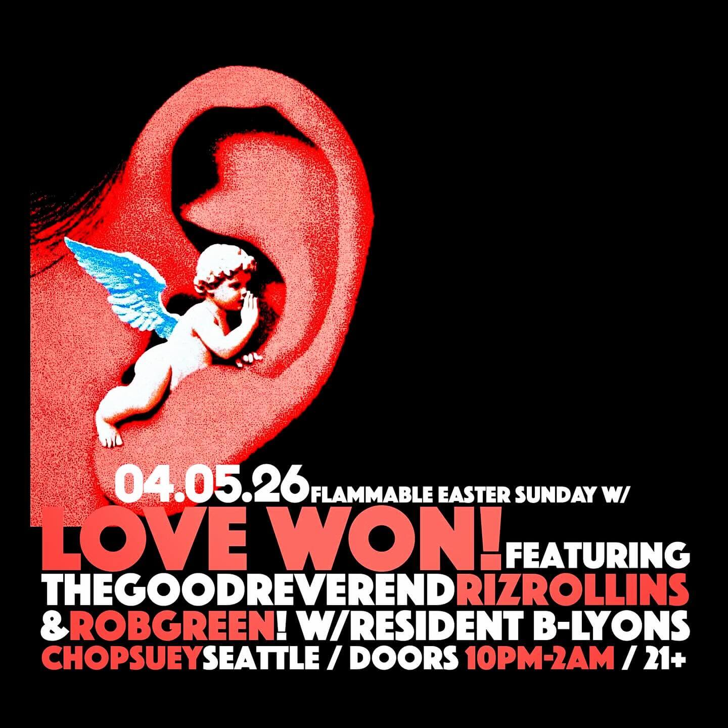 FlammablePresents: EasterSunday w/ RIZ ROLLINS & ROB GREEN! This Sunday It’s time for some LOVE WON vibes! Annnnnddd.. Rob’sBigFlammableBirthdayBash!™ featuring the inimitable duo RIZ ROLLINS & ROB GREEN! B-Ly on the early shift, only at Chop Suey.