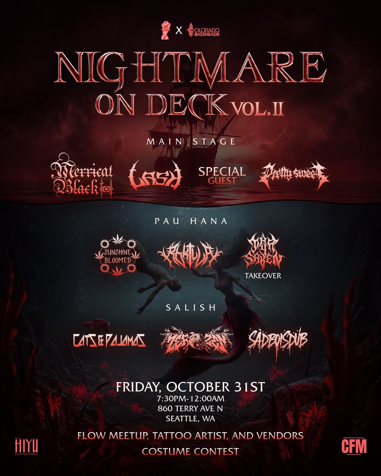 Halloween Party on a boat? Say less. Seattle, Get your costumes ready! Vibrant Vibez × Colorado Bassheads are teaming up to bring you a Halloween experience like no other. Denver’s bringing the heat to Seattle for a spooky night packed with riddim, experimental bass, and melodic vibes. It’s time to get spooked On The Hiyu.