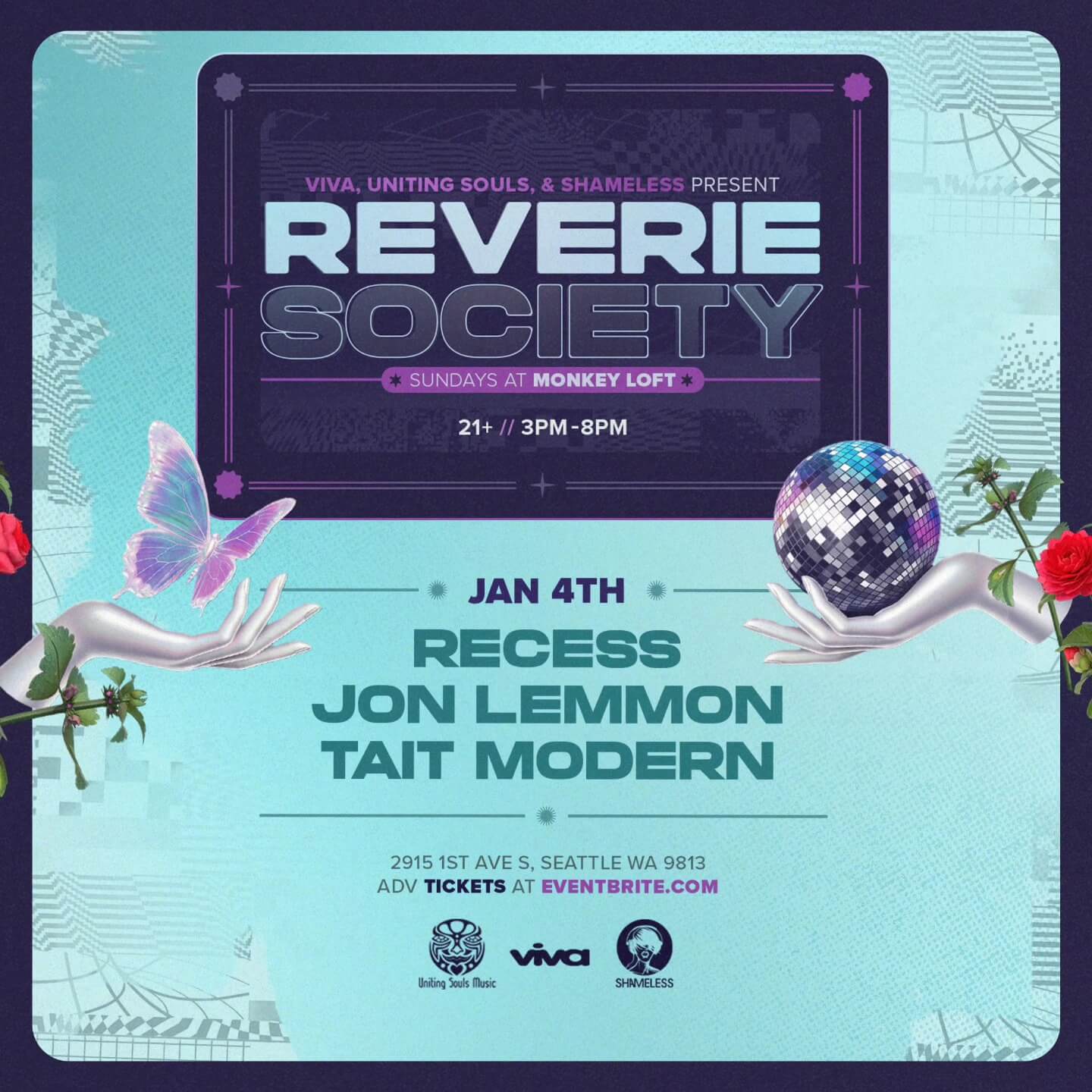 Come out on Jan 4th with Uniting Souls, Viva and Shameless for Reverie Society at Monkey Loft! A Sunday day-party at Monkey Loft! Expect daytime party vibes, house music with all your friends, and Monkey Loft will be serving up happy hour drinks, including non-alcoholic options.