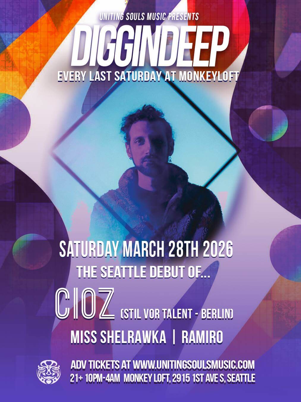 Uniting Souls Music presents Diggin’ Deep: 2 rooms of music, every last Saturday. Cioz (Monaberry, Get Physical, Stil Vor Talent
